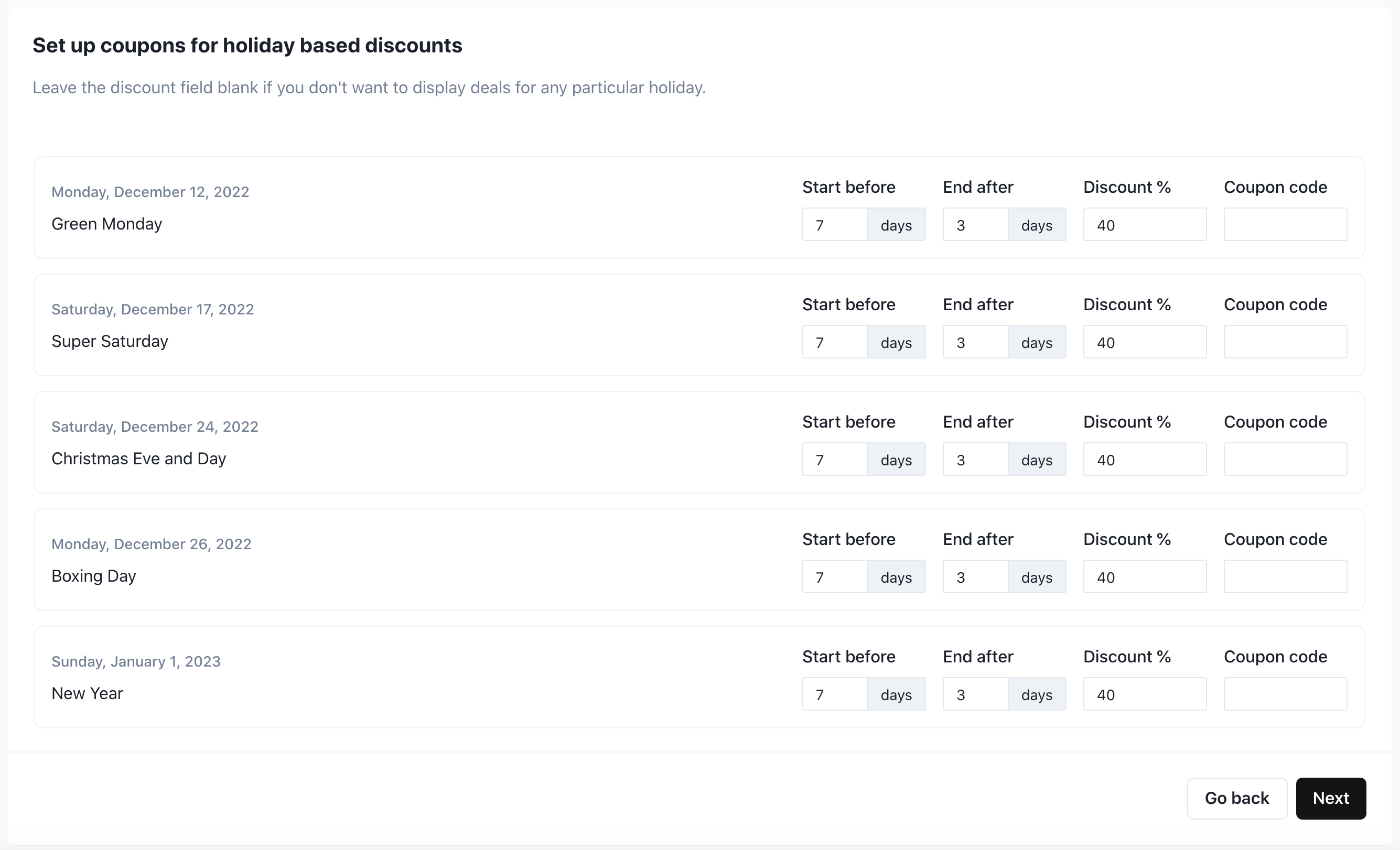 - If you have already created discount coupons on your integrated platform, you can enter them under each holiday.